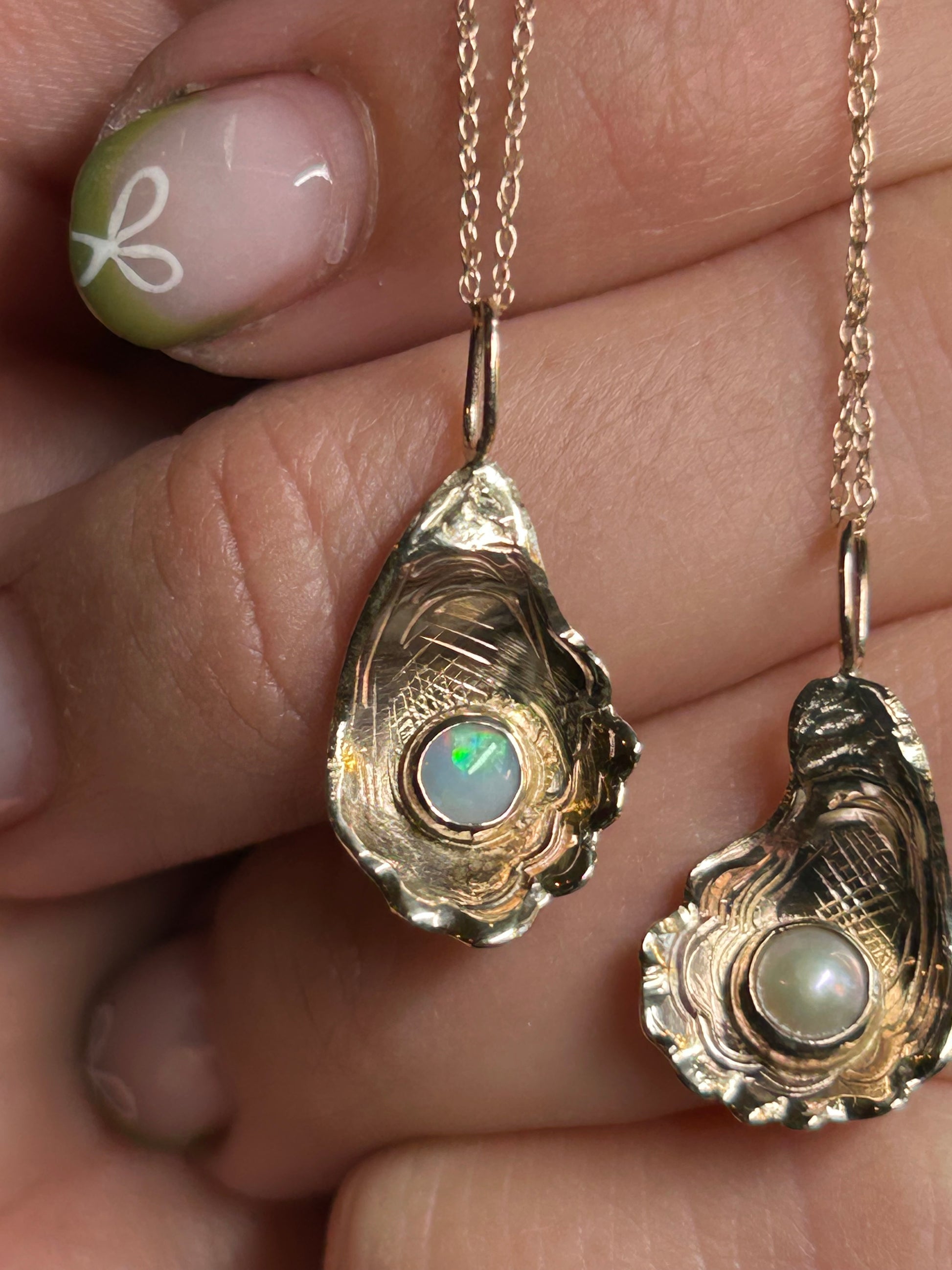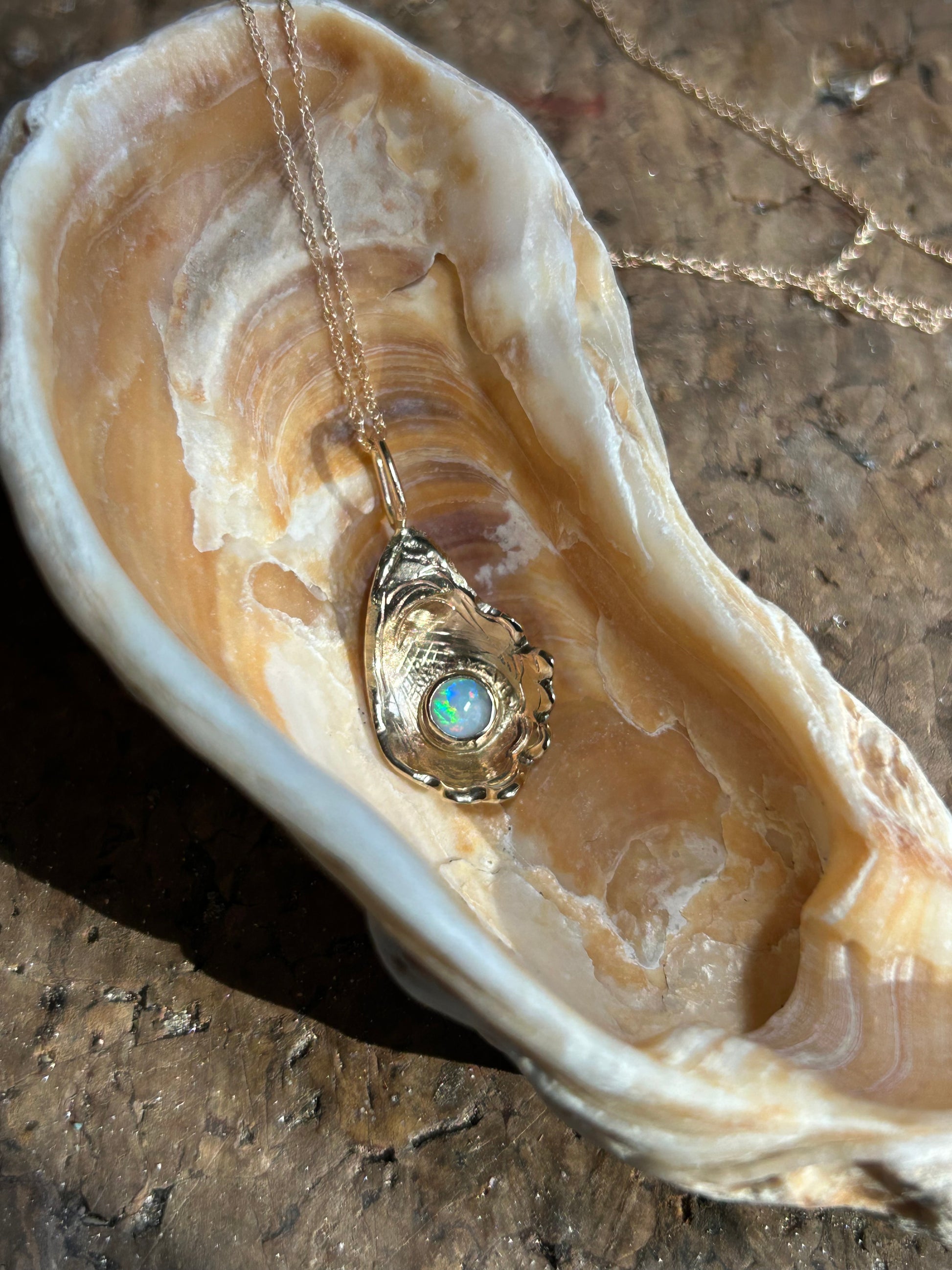 This 14 karat gold oyster necklace began as just a flat sheet of gold and was sawed out, shaped and then hand engraved to be a one-of-a-kind oyster shell just like the ones we enjoy at our favorite restaurant or even find on the beach.