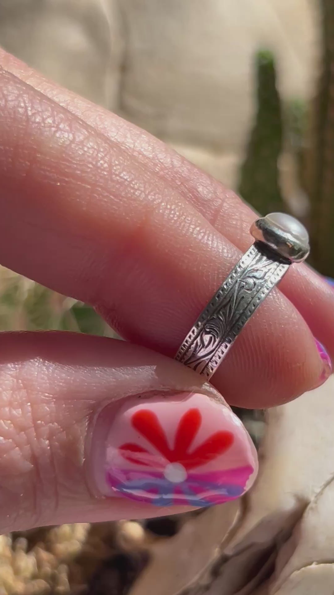 This was a sweet little 5mm freshwater pearl I set on top of this hand engraved sterling wide band. Size 4.5 makes for a great pinky ring or smaller finger ring.