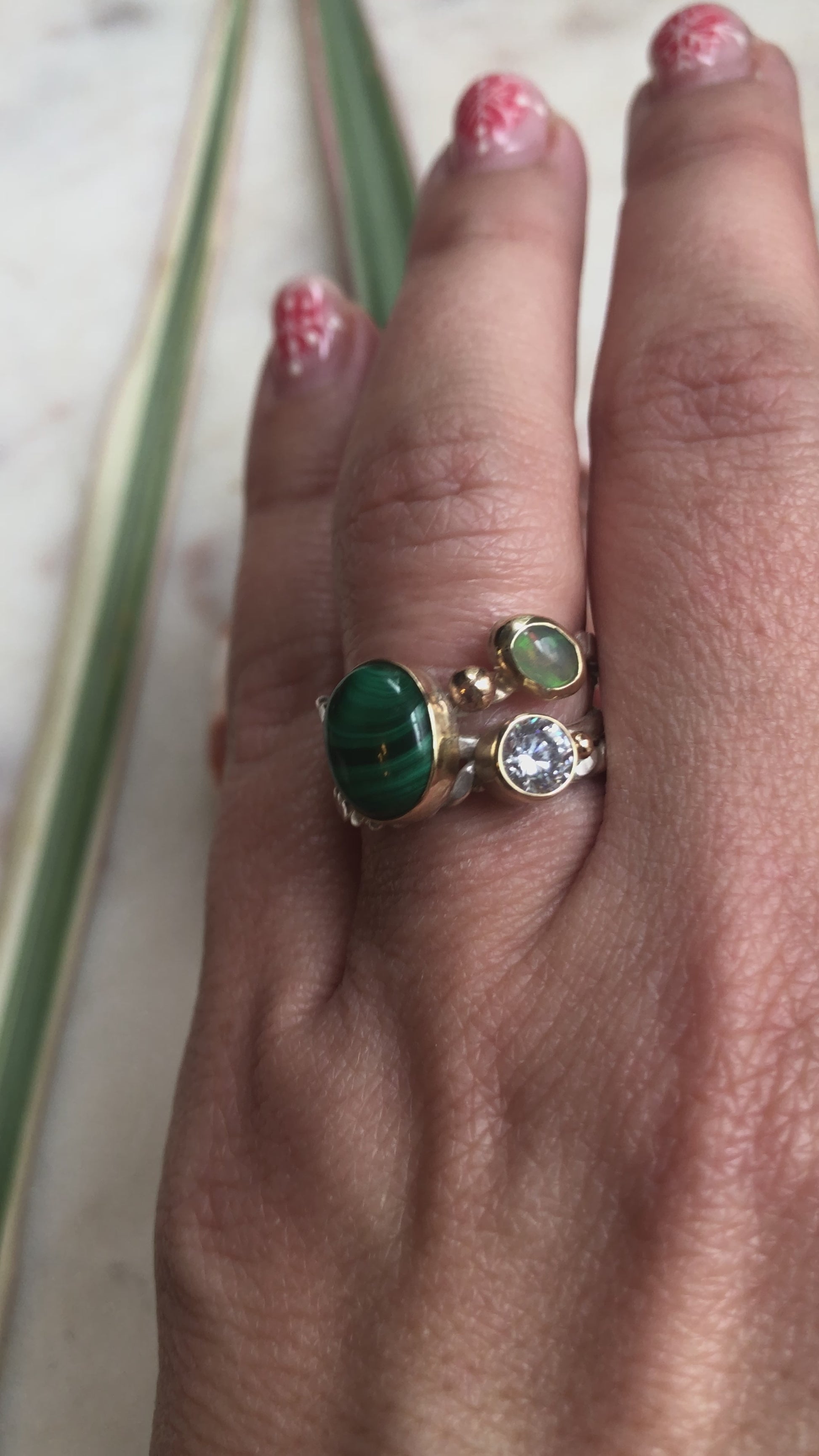 Introducing our exquisite Green Malachite, Ethiopian Opal, and sparkly CZ set 10K gold bezel with sterling silver multi bands in size 6.5! 💚✨