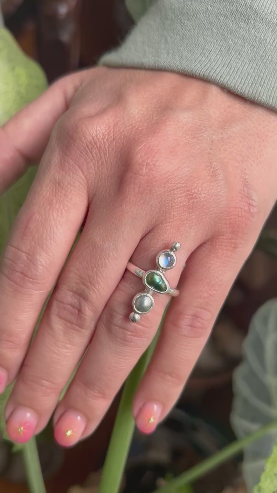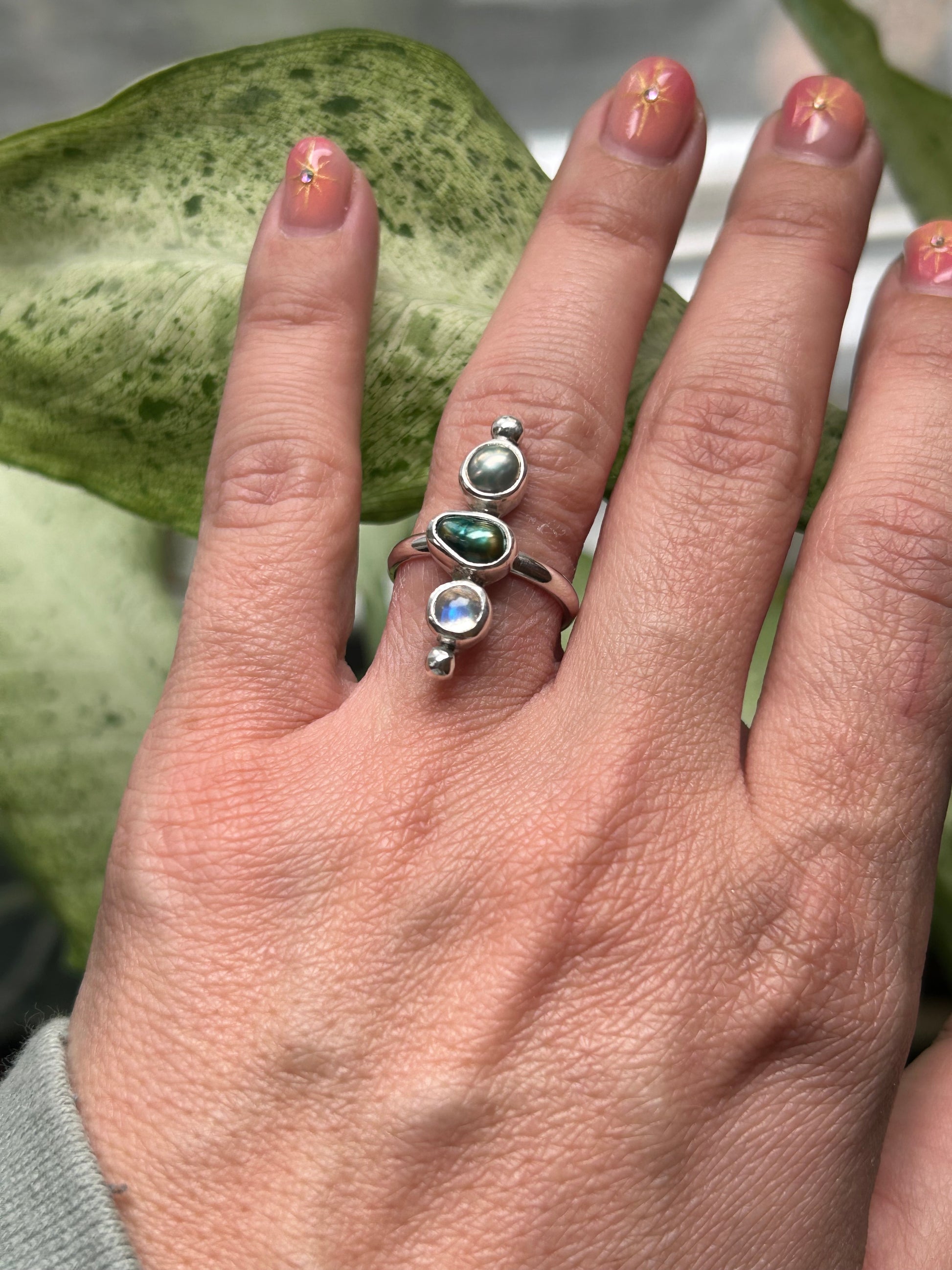 This size 7 ring features a central dyed forest green freshwater pearl with Moonstone on the top and another dyed sage green pearl on the bottom.