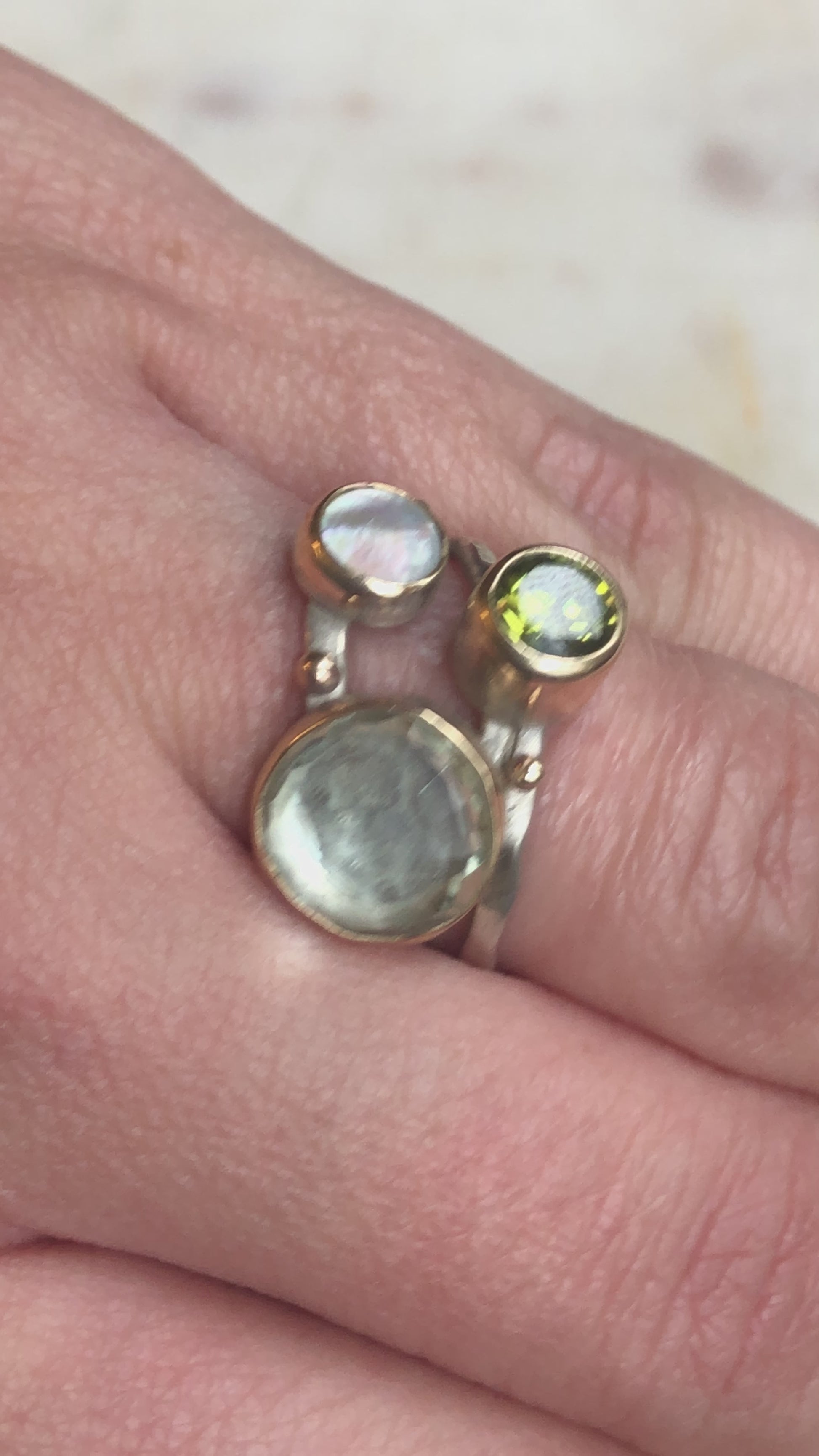 Mother of Pearl, Peridot and Green Amethyst Multi band ring with 14K Gold Bezel and Accents