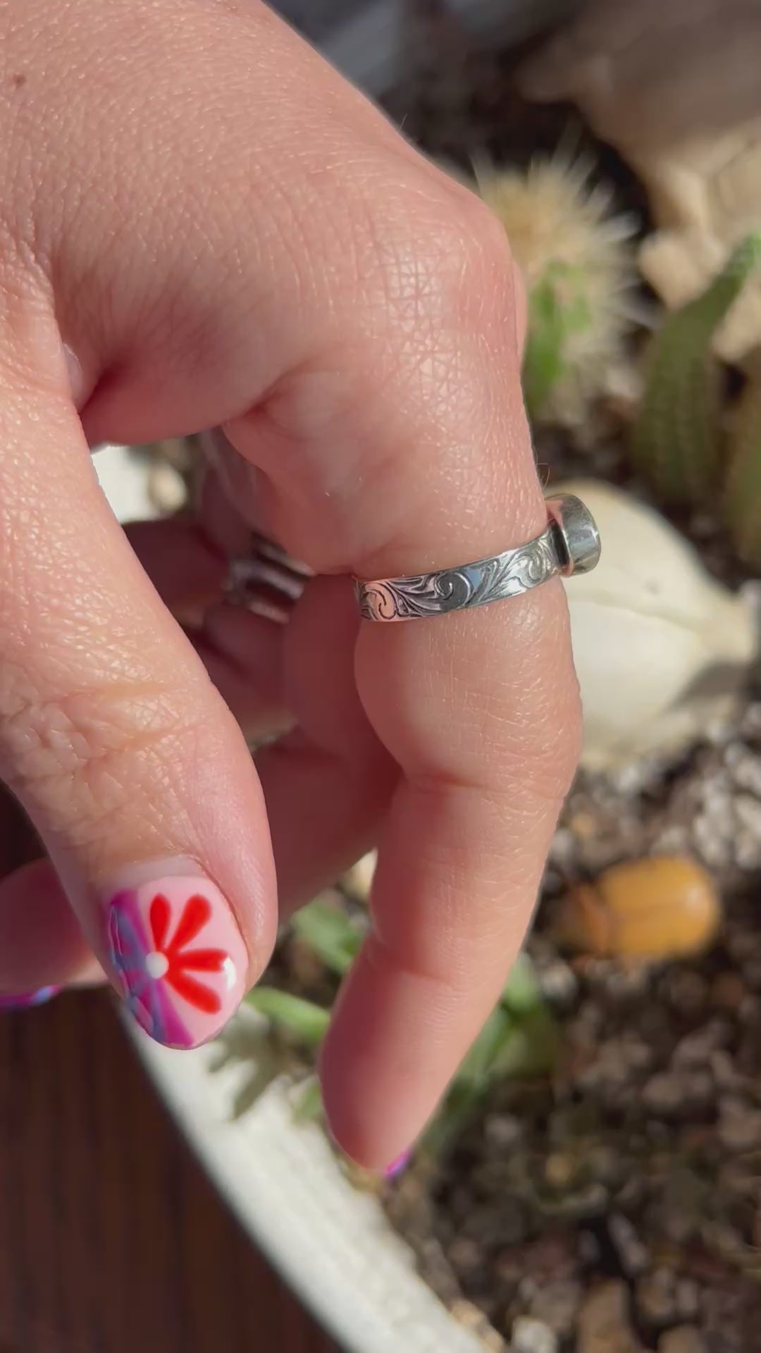 This handmade one-of-a-kind ring is created with Palomino turquoise - a beautiful vivid lime green and yellow streak turquoise that has been set in fine silver bezel and set in the east west orientation that has a contemporary and fresh look. The sterling wide band has been hand engraved with a traditional western scroll pattern. Size 6.5