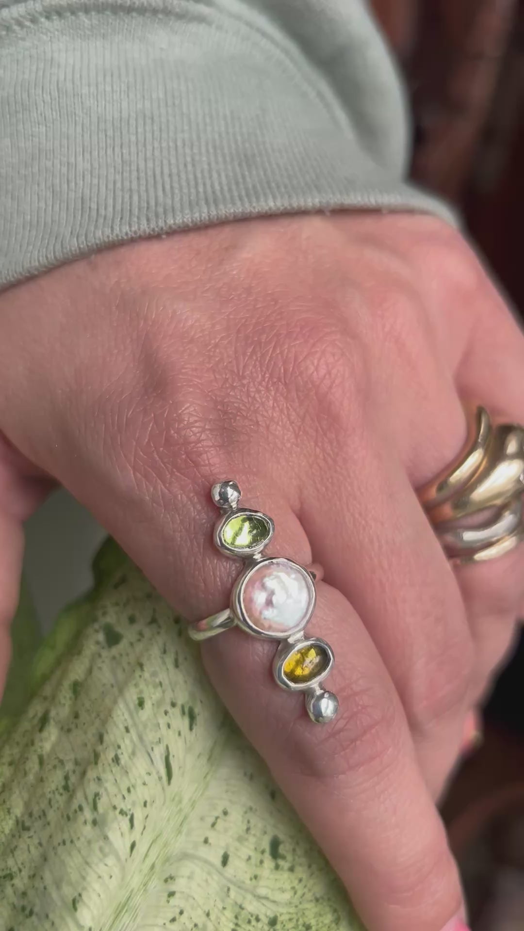 Peridot, Tourmaline and Freshwater Pearl ring size 7.5