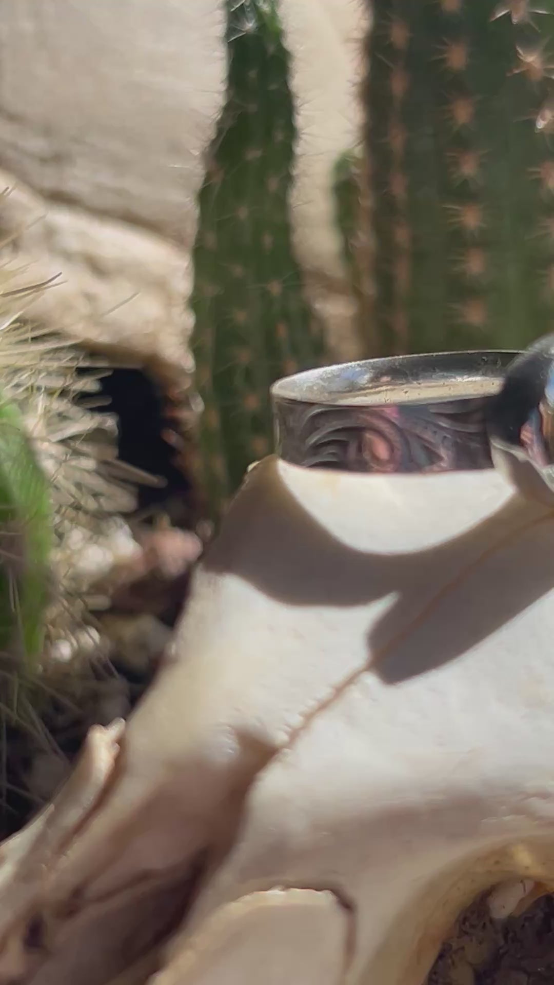 This handmade one-of-a-kind ring is created with Sonoran Gold turquoise - a beautiful dusty green variety that has been set in fine silver bezel and set in the east west orientation that has a contemporary and fresh look. The sterling wide band has been hand engraved with a traditional western scroll pattern. Size 4.5 making a great pinky ring or for a small finger.