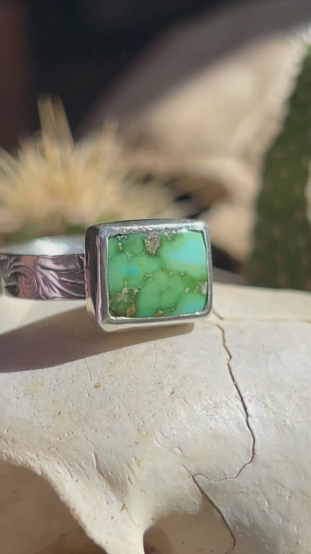 This handmade one-of-a-kind ring is created with Sonoran Gold turquoise - a beautiful vivid green and blue variety turquoise that has been set in fine silver bezel and set in the east west orientation that has a contemporary and fresh look. The sterling wide band has been hand engraved with a traditional western scroll pattern. Size 8