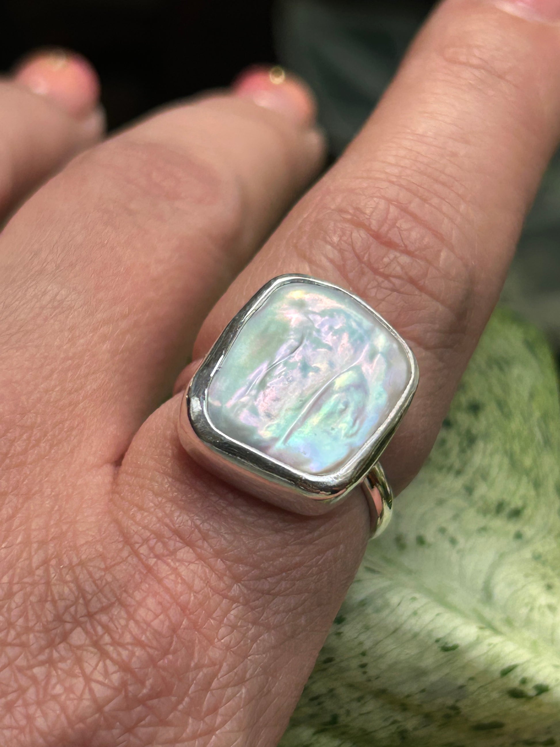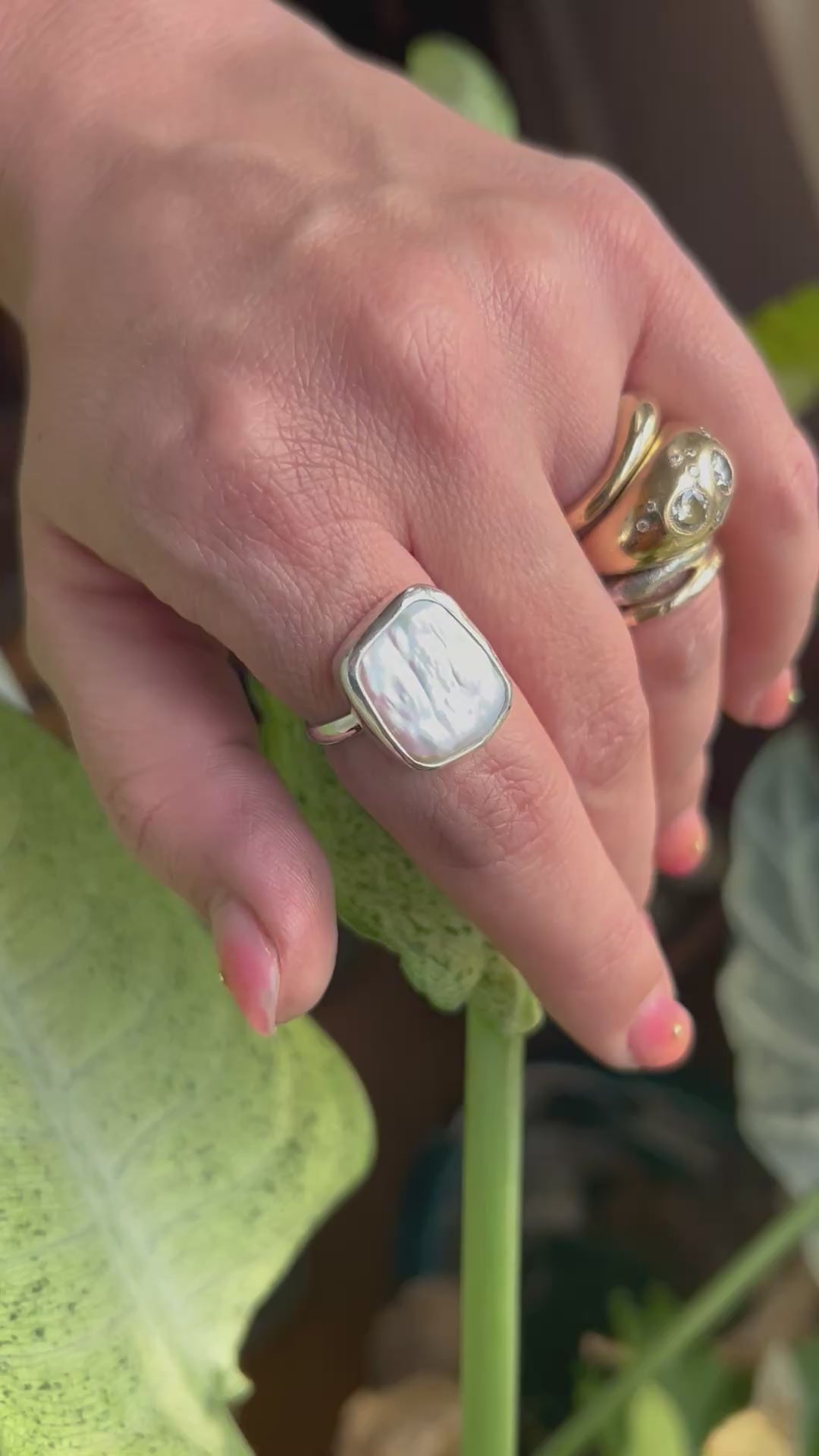 This ring - the Jasmine ring is beautiful new shape of freshwater pearl I’ve found on my last journey to Tucson. It’s a loosely shaped rectangle with a gorgeous iridescent glow.